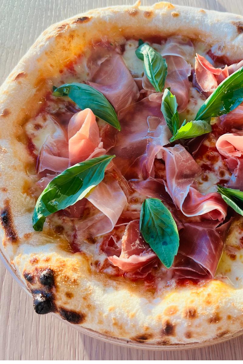 Surdeigspizza med tomatsaus, revet mozzarella, Parmaskinke (blir lagt på etter steking) og basilikum.