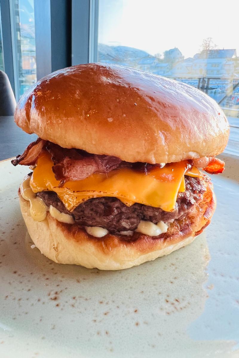 NOK 285.00 Kjøtt, Cheddar, Bacon, BBQ sauce, Chili mayo, Srirasha og Fries